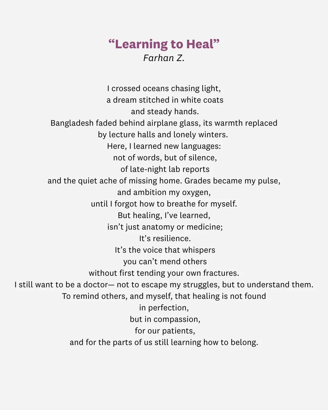 Farhan’s poem, “Learning to Heal,” reflects on transition, identity, and the pressure faced by students navigating demanding academic paths. As an international student from Bangladesh, Farhan explored how ambition, isolation, and mental health intersect with his desire to study the diverse field of medicine.