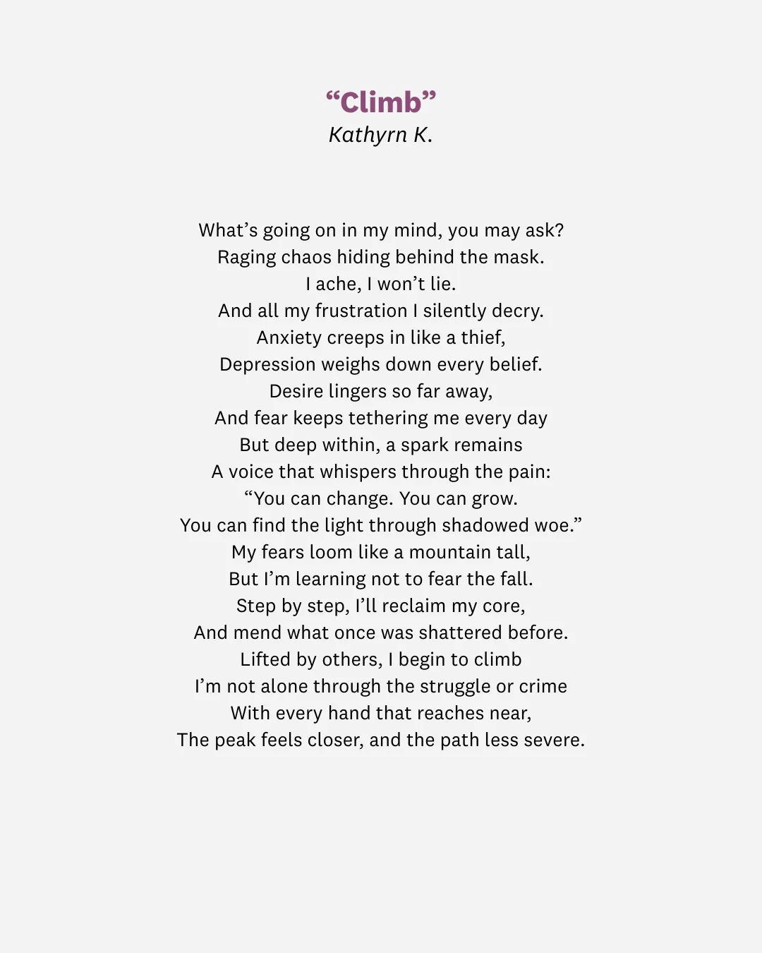 Kathryn contributed a poem titled “Climb,” a creative reflection on anxiety, depression, recovery, and resilience. Her work centers on the idea that healing requires both internal strength and support from others.