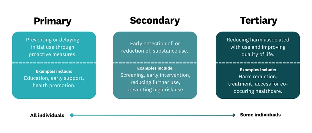 Primary prevention has a universal target with a broad reach, designed to prevent or delay substance use within a broad group of individuals before substance use begins. Promotion is proactive and holistic and includes building protective factors, providing judgement-free substance use education, early support and health promotion. It is often the most cost effective.